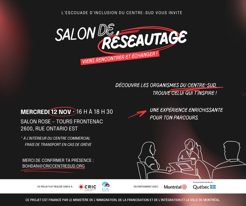Le CRIC et la CDC Centre-Sud organisent une activité de réseautage pour faire découvrir les organismes du quartier et encourager les échanges entre nouveaux arrivants, immigrants et citoyens du Centre-Sud. Inscription : bohdan@criccentresud.org