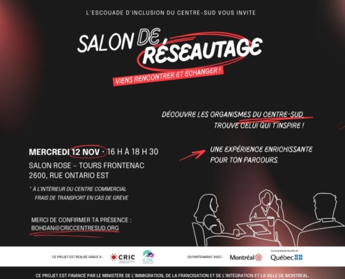Mercredi 12 novembre 16 h à 18 h 30 Salon rose – Tours Frontenac, 2600 rue Ontario EstLe CRIC et la CDC Centre-Sud organisent une activité de réseautage pour faire découvrir les organismes du quartier et encourager les échanges entre…